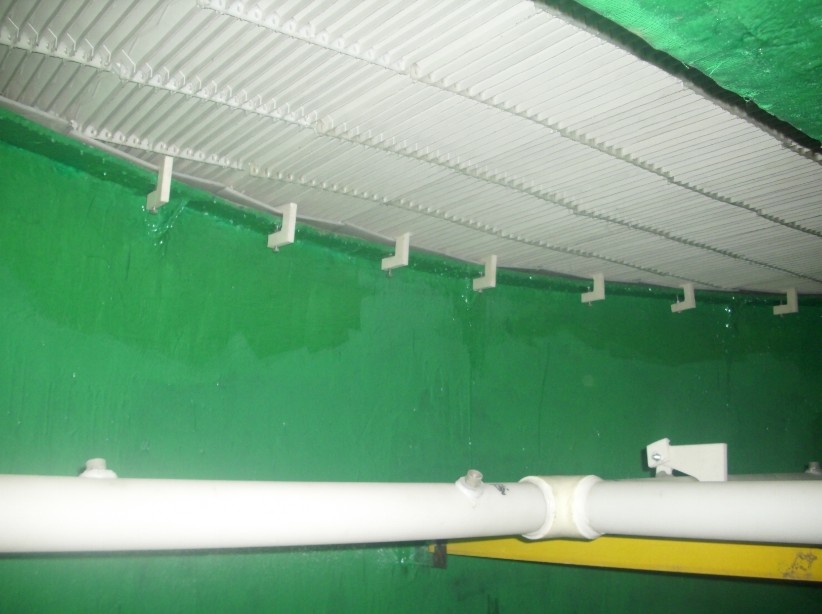 框板式平板除雾器由两层平行除雾器及三层冲洗水组成。下层为粗除雾,二层除雾器为精除雾。 除雾器标准模块由20片叶片组成,二层除雾器标准模块由26片叶片组成。叶片之间通过定位杆将其固定。然后在和叶片焊接到一起,定位杆不会脱落,同时,也增大了除雾器的承载能力 框板式平板除雾器冲洗水系统包括: 喷嘴、管道、管卡等。电除雾器清洗水管、喷嘴及管卡由增强聚丙材料制作。冲洗水布置形式为 除雾器上下层和二层除雾器下游。除雾器冲洗系统设计能充掉污垢,使除雾器避免结垢以长期无故障运行。冲洗系统在除雾器运行时候,根据一个设定的可变程序,以设定的水量自动运行,既可单层运行,也可在几层之间互相切换。 框板式平板除雾器设计特点: 注塑成型、耐拉伸、承载好 耐温性能好、短时间(10分钟)可达120℃ 系统阻力小、满负荷运行时≤150Pa 施工和安装简单、方便 易于人工检修和 换 易于冲洗和 换冲洗水管 框板式水平除雾器设计参数: 出口液滴含量:≤75㎎/Nm³ 分割雾滴粒径:≥26μm 压降:≤150Pa 烟气流速;2.5~4.5m/s